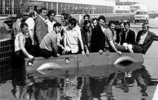 Проверка первого кузова амфибии на герметичность в глубоководной ванне трека ВАЗа (весна 1976 г.).