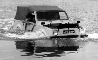 Так выглядели первые образцы вазовской амфибии. На снимке – образец № 2, отличающийся от первого лишь цветом и дополнительными боковыми окнами в задней части тента. Машина подготовлена к плаву (щиток волноотражателя откинут вперёд, передний воздухозаборник закрыт номерным знаком).