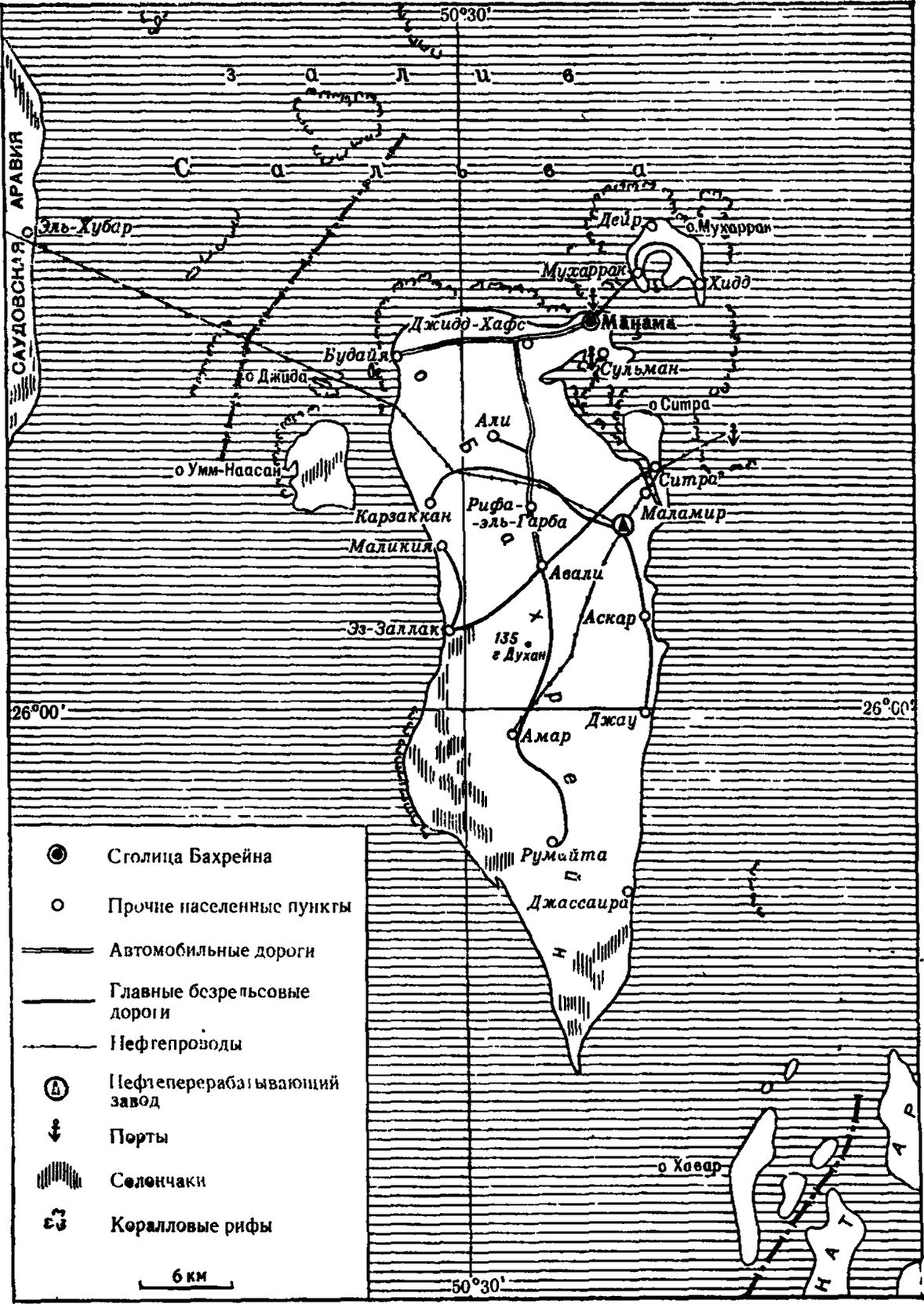 Бахрейн... Легендарный и удивительно будничный, небольшой по размерам, но хорошо известный во всем мире, этот архипелаг раскинулся в северной части Персидского залива. Он состоит из 25 островов. Самый крупный – Бахрейн – имеет продолговатую форму, его максимальная длина – около 50 километров; ширина – 16 километров. Другие острова: Мухаррак, Ситра, Умм-Наасан, Умм-Ас-Суббан, Джида. Остров Бахрейн соединен дамбами с Мухарраком и Ситрой. Общая площадь всех островов – 598 кв. километров. На этой территории в 1972 году проживало 220 тысяч человек.
