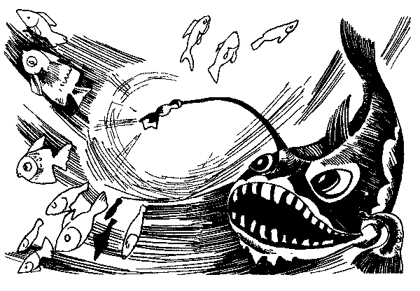 – Боюсь, что я не смогу оценить величие самопожертвования до конца, – вздохнул удильщик, которого начинали раздражать манеры пучеглазой рыбы, пожелавшей сохранить инкогнито. Он уже искал предлога, как бы улизнуть от этой скучной беседы, которая, казалось, могла продолжаться ещё очень долго. Но больше маленькая пучеглазая рыбка ничего не успела сказать, – огромное стремительное тело, вынырнувшее откуда-то сверху, рванулось к пучеглазой рыбке и… рраз! Маленькой рыбки не стало. В тот же миг огромная толстая рыбка (а это была действительно огромная и толстая рыба) быстро повернулась к удильщику.