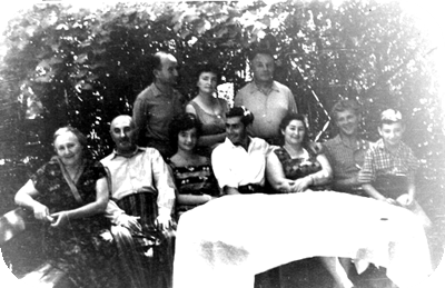 Стоят: Папа, Аба Курцман. Сидят: Г. Лимонова (?), мама, Боря Плужниченко, Ира Тартаковская, Эмма Сатановская (?), Натан и Сара Перельмутер-Кацеф, Ира Факебаум
