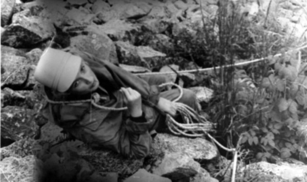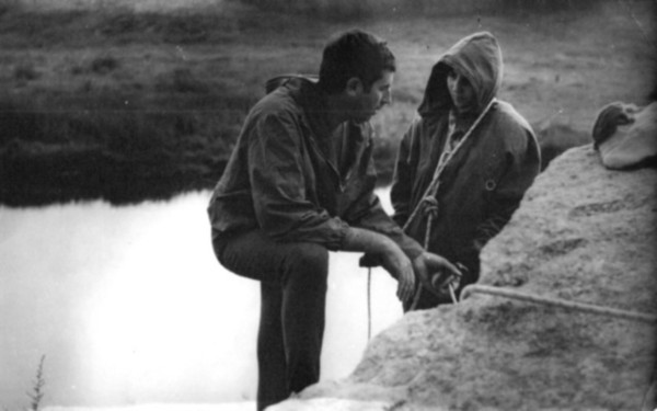 Вадик инструктирует Аллу Ившенко на занятиях по скалолазанию на вершине скалы над р. Рось – 1977 год