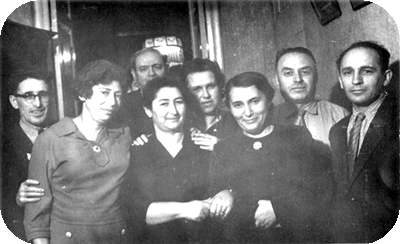 Мама с друзьями в квартире на Пушкинской. Слева направо: 1-й ряд: Лева Кошарский с женой Леной (Файнгерш), Мила, Ида Леви с мужем Мотей. 2-й ряд: Белорусец, Люба Акимова, папа Миша