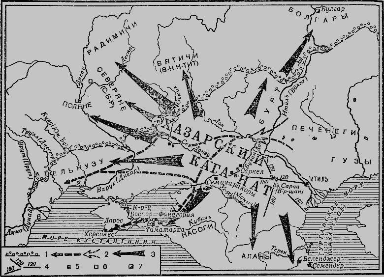 1 – Границы леса с лесостепью; 2 – Путь печенегов по южнорусским степям в конце IX в.; 3 – Направления экспансии Хазарского каганата в VIII–IX вв.; 4 – Расстояния от летней ставки Кагана на реке В-р-шан до границы личного домена; 5 – Хазарские крепости и города VIII–IX вв.; 6 – Русские города IX–X вв.; 7 – Столица Волжской Болгарии