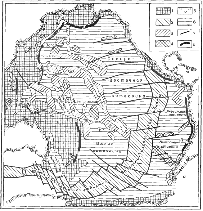 1 – подводные окраины материков и переходные зоны, 2 – срединноокеанические хребты, 3 – сводовые и сводово-глыбовые океанические поднятия, 4 – глыбовые хребты и плато, 5 – вулканические хребты (1 – Северо-Западный, 2 – Гавайский), 6 – океанические котловины, 7 – разломы, 8 – глубоководные желоба (А – Алеутский, Б – Курило-Камчатский, В – Марианский, Г – Кермадек, Д – Чилийский)