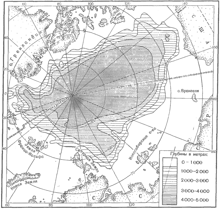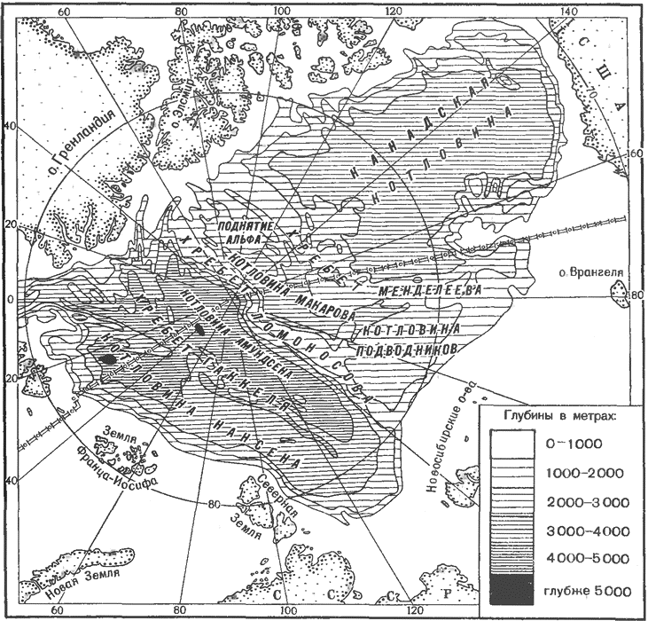В итоге многолетнего изучения Северного Ледовитого океана советские полярники установили, что его дно расчленено тремя подводными горными цепями – Ломоносова, Менделеева и Гаккеля. Хребет Ломоносова, имеющий много отрогов, протягивается примерно на 1800 км от Новосибирских о-вов через Северный полюс к о. Элсмир; в Арктическом бассейне глубина над ним 954–1650 м, над дном океана он возвышается на 3,3–3,7 км, а ряд острых вершин – до 4 км. Хребет Менделеева, отделенный котловиной Подводников от хребта Ломоносова, простирается от его центральной части примерно по 180° к материковому склону Чукотки; средняя высота над дном около 1 км. Подводный хребет Гаккеля (длина почти 2000 км, средняя высота около 1,5 км) располагается западнее цепи Ломоносова и отделен от нее котловиной Амундсена, самой глубоководной акваторией Ледовитого океана. Далее к юго-западу обнаружена котловина Нансена, характеризующаяся преобладанием глубин более 4 км (максимум – 5449 м).