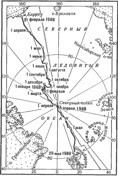 Грохот ломающейся льдины в конце февраля 1969 г. возвестил о начале нового этапа похода. Херберт и его спутники, включая пострадавшего, поставленного на ноги заботливым уходом, направились к полюсу. Ориентироваться приходилось только по Венере: солнце и луна на небосклоне еще не появлялись. Морозы достигали 48° С. «Холод был поистине нестерпимым. Мы, казалось, промерзали насквозь. Часто мы бывали отчаянно голодны и испытывали сильную жажду, но не могли останавливаться днем, чтобы разбить палатку. Примерно с 8 утра до 8–9 вечера мы не ели и не пили ничего горячего, а к концу тяжелого перехода просто заваливались в спальные мешки и быстро засыпали» (У. Херберт).