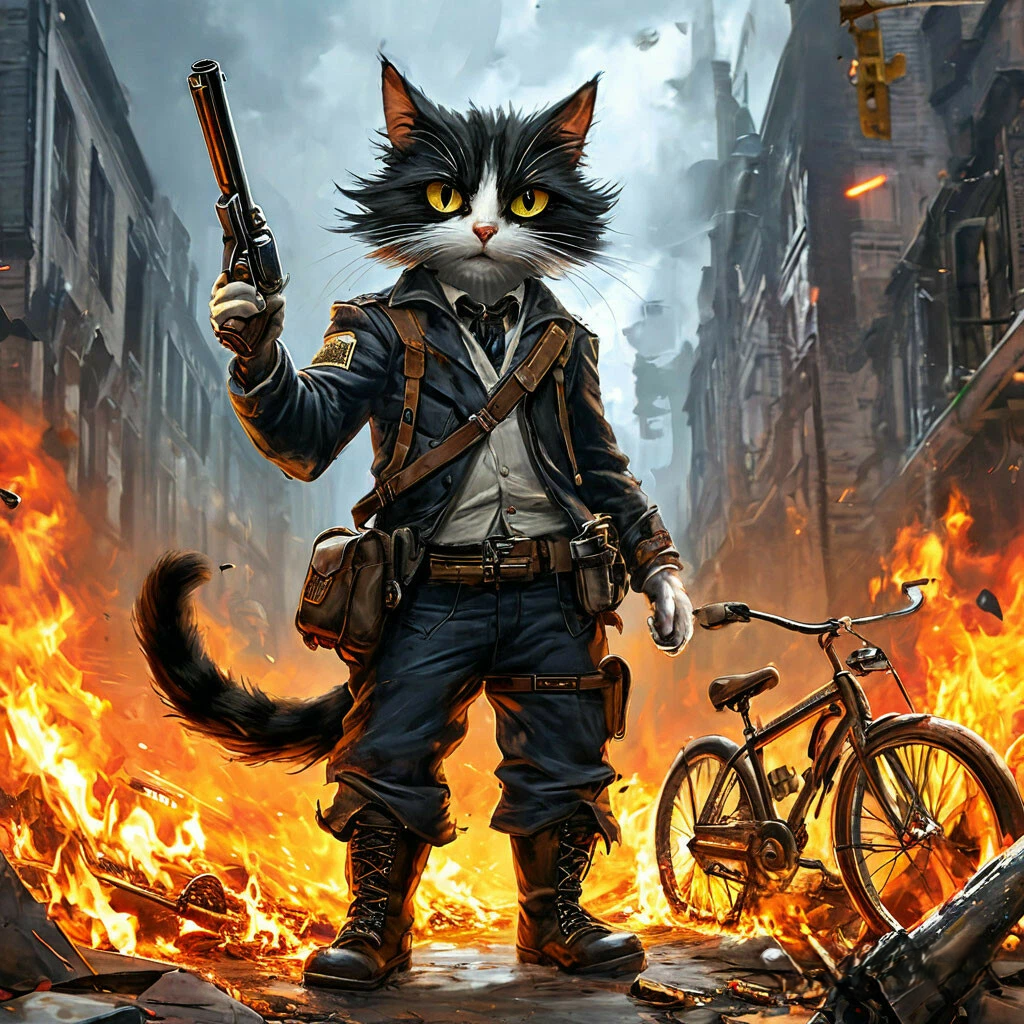 Большой кот, с черно белой мордой, в высоких шнурованых ботинках, сумка игрока на боку, синие штаны, синяя куртка, светлый жилет и черный галстук на шее, в руке такой же как и у девушки немаленького клабира револьвер, позади него прямо в горящем пламени стоял велосипед, чем то одежда каджи напоминала одежду из конца 19 века.