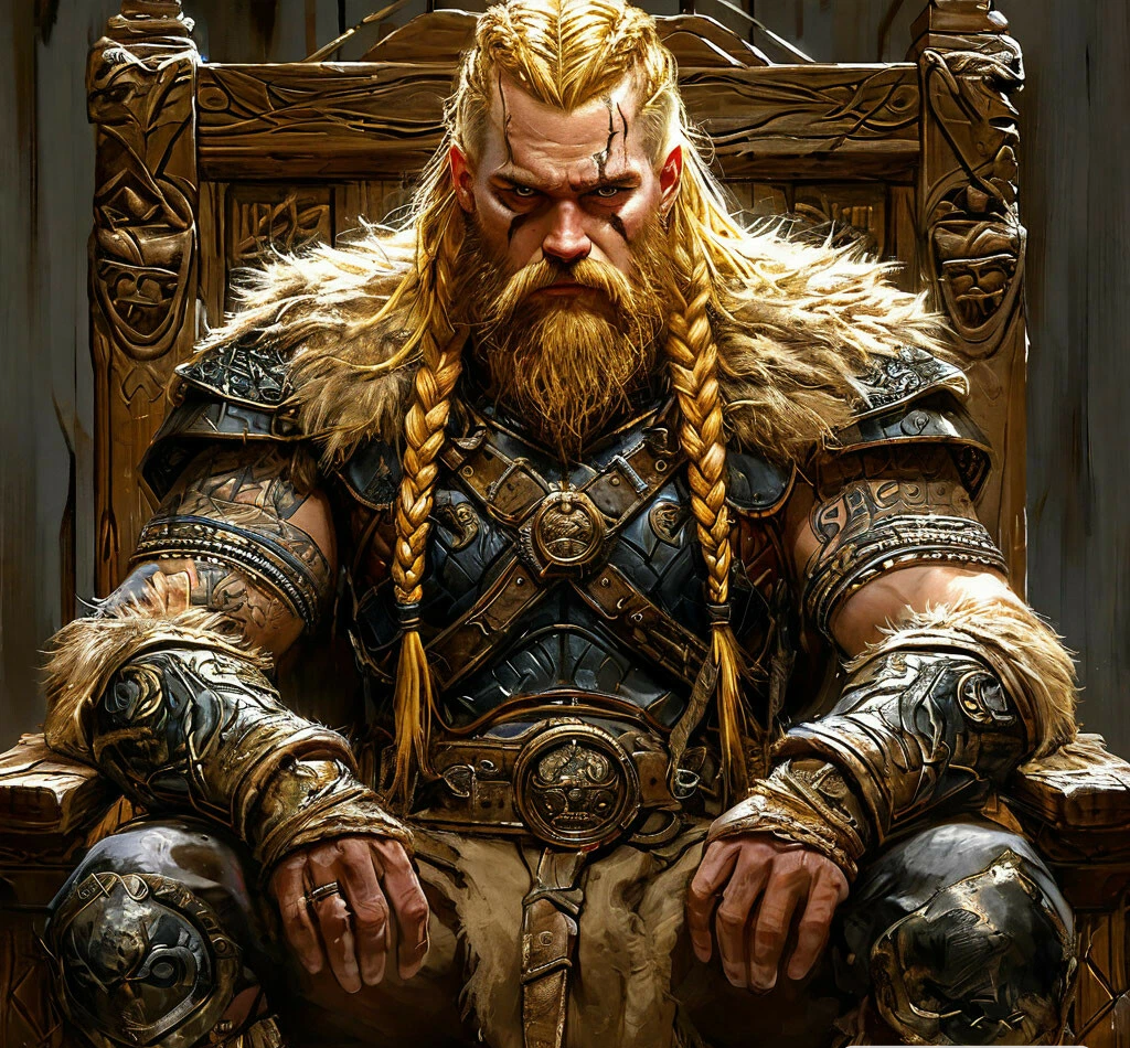 Пройдя в приоткрытую дверь я оказался в отдельном зале, где был один стол, во главе которого на стуле с высокой спинкой сидел вроде как и человек, а вроде как и нет, было что то в нем звероватое, золотистые волосы, заплетены в косы, короткая борода, над правым и левым глазом шрамы, одежда смесь меха и кожи.