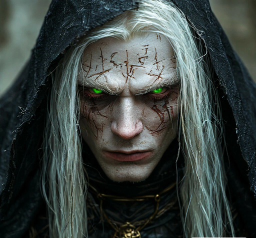 Немного в стороне от стола сидел в темном углу худой человек с длинными седыми волосами, бледным лицом и зелеными глазами, в которых то и дело я видел пробегающие символы, лоб и щеки были изрезаны какими то знаками.