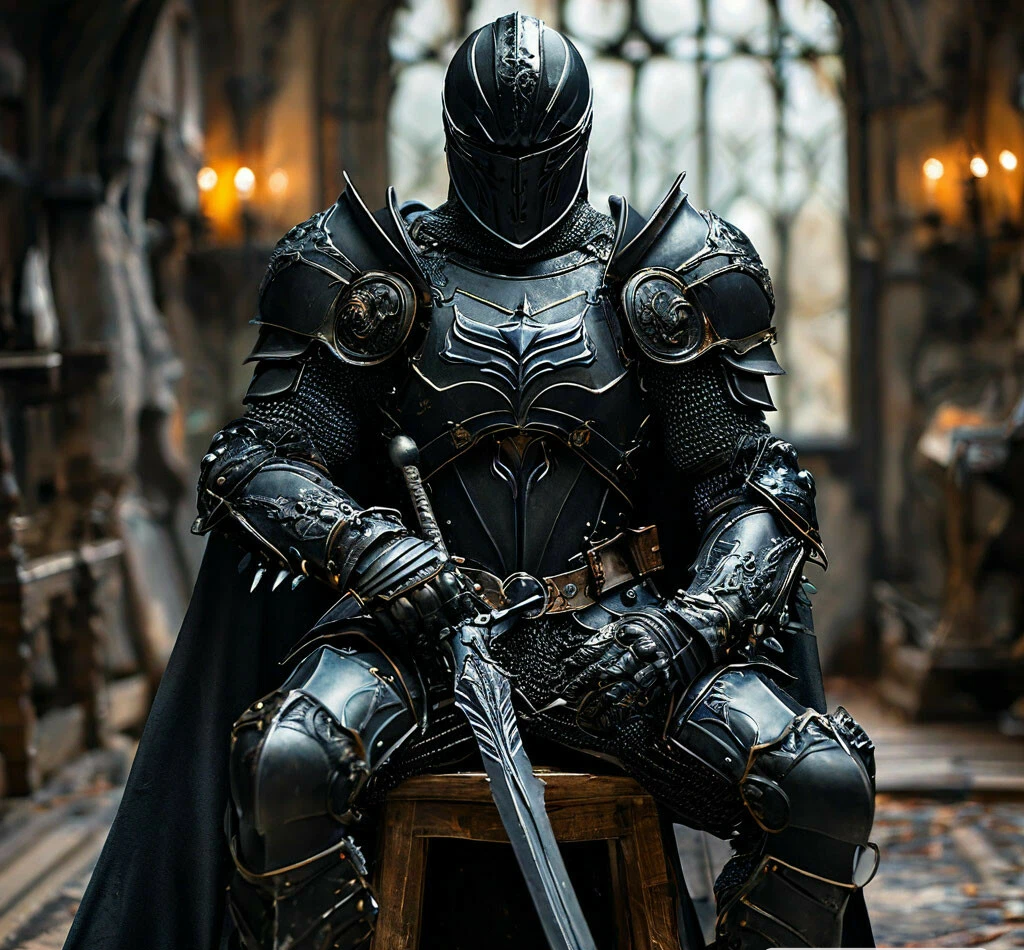 По другую сторону от стола сидел рыцарь в черных доспехах, глухом шлеме и с мечом упертым в пол, который он придерживал рукой, надпись над ним меня немало удивила.
