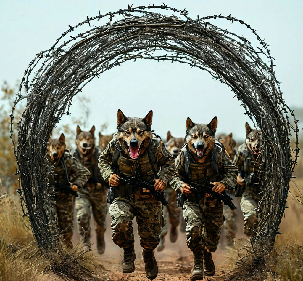 Мрачновато но ладно, уже собрался двигаться ко входу как произошло еще несколько событий, рядом открылся еще один портал в виде арки из колючей проволоки, причем это был не туннель как у меня, а именно портал, с той стороны было видно голубое небо и земля с зеленой травой, в портал влетело какое то мохнатое ушастое существо на...….велосипеде, следом за существом из портала ломанулась толпа нууу скажем так собакоголовых людей, в руках все они держали оружие похожее не земной аналог Узи.