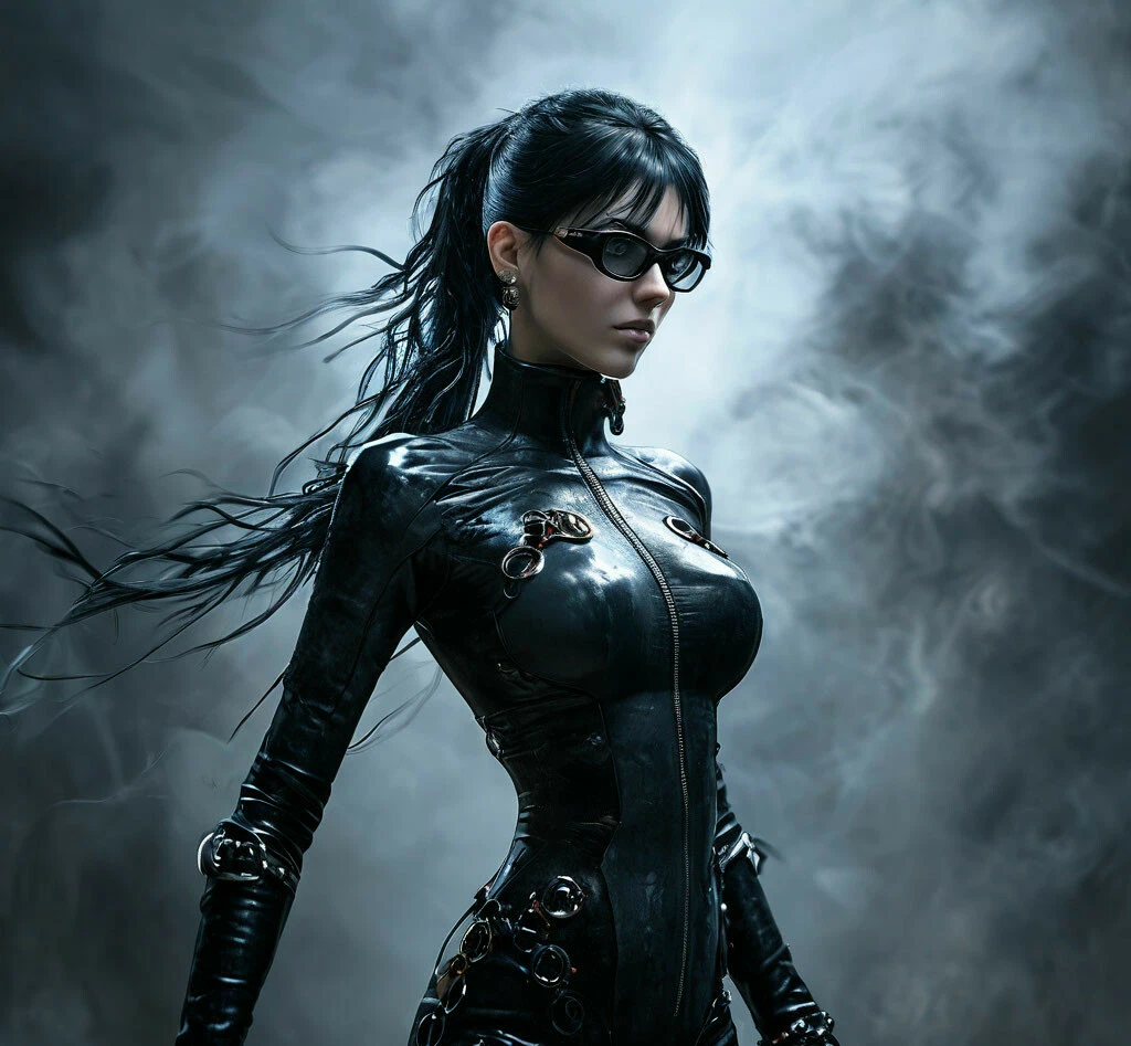 одновременно с этим рядом образовалось облако густого белого дыма, из которого вышла девушка в черном обтягивающем худощавую фигуру костюме, на высоких каблуках, в слегка затемненных очках, с тонкими чертами лица.