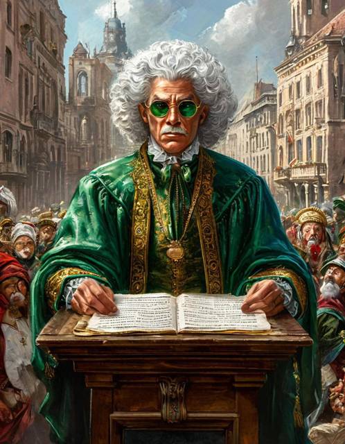 Слева, на возвышении, восседал королевский судья, готовящийся зачитать обвинительный приговор. На нем топорщились мучнистый с кудрями парик и квадратная судейская шапочка поверх зеленых очков.