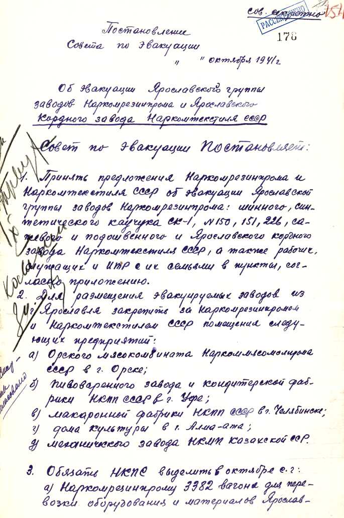 Постановление Совета по эвакуации «Об эвакуации наркоматов и центральных учреждений из Москвы». 15 октября 1941. [ГА РФ. Ф. Р-6822. Оп. 1. Д. 542. Л. 154]