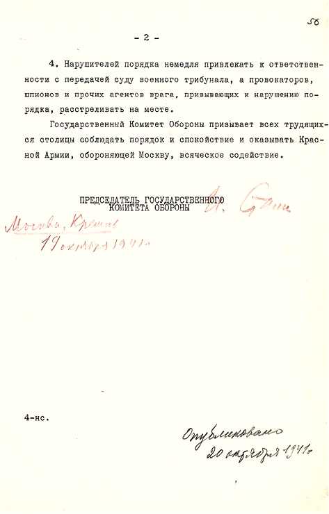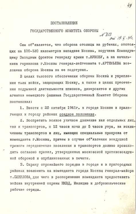 Постановление ГКО СССР № 813 «О введении осадного положения в Москве и прилегающих к городу районах». 19 октября 1941. [РГАСПИ. Ф. 644. Оп. 2. Д. 23. Л. 49–50]