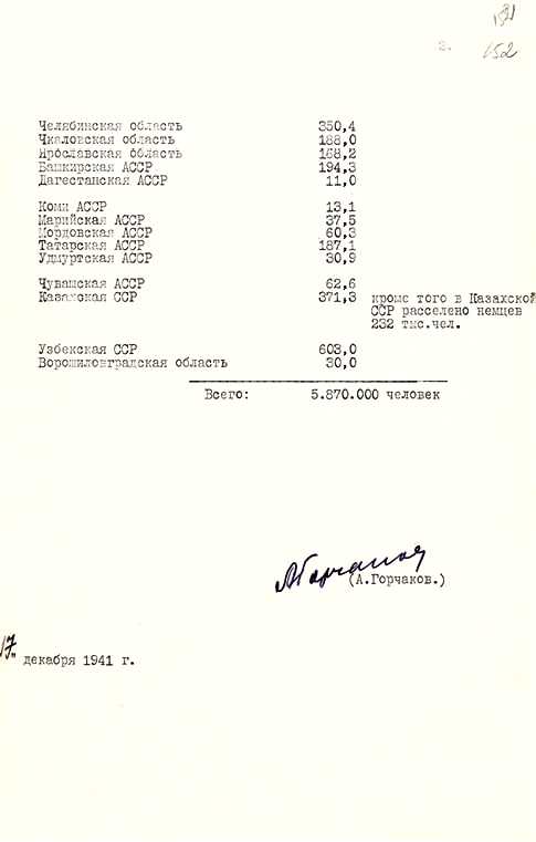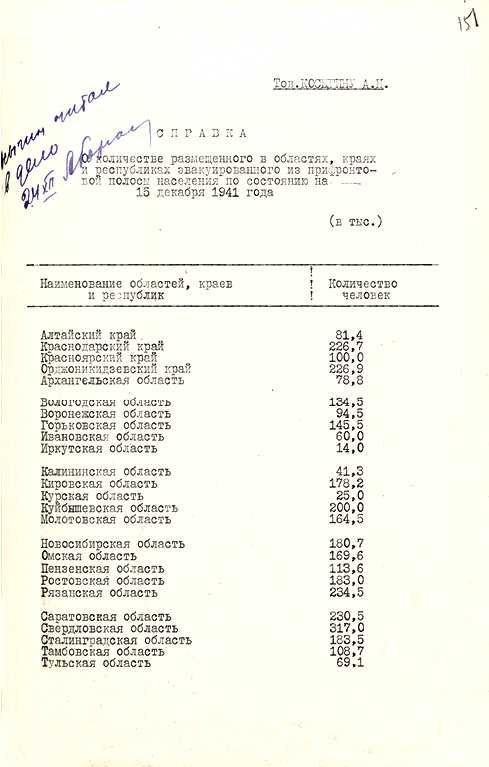 Справка А. К. Горчакова, направленная А. Н. Косыгину, о количестве размещенного в областях, краях и республиках эвакуированного из прифронтовой полосы населения по состоянию на 15 декабря 1941 года. 17 декабря 1941. [ГА РФ. Ф. Р-6822. Оп. 1. Д. 481. Л. 151, 152]