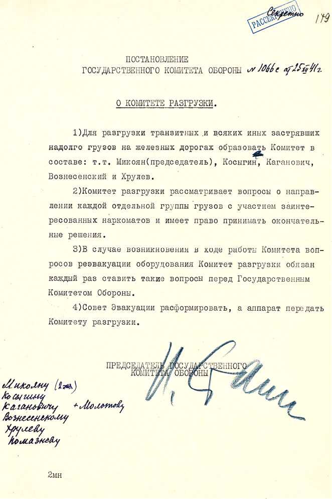 Постановление ГКО СССР № 1066с «О комитете разгрузки». 25 декабря 1941. [РГАСПИ. Ф. 644. Оп. 2. Д. 30. Л. 179]