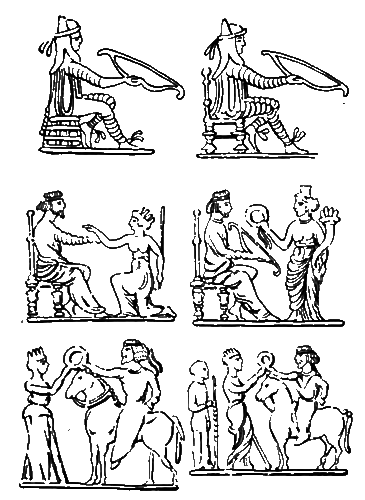 Новые цари не порвали тесных связей с приведшей их к власти кочевой средой. На оборотной стороне аршакид-ских монет помещается традиционное изображение Аршака, сидящего на троне с символом своего могущества – смертоносным луком в руках. Иногда мы видим здесь и изображения того, как богиня античного облика преподносит венок победоносному царю, держащему неизменный лук. Один из Аршакидов даже принимает такой венок, сидя верхом, это тоже, конечно, символ. Действительно, легкая кавалерия (неотразимые парфянские лучники) и тяжелая конница из бронированных всадников и коней (катафрактарии) составляли ударную силу парфянской армии.