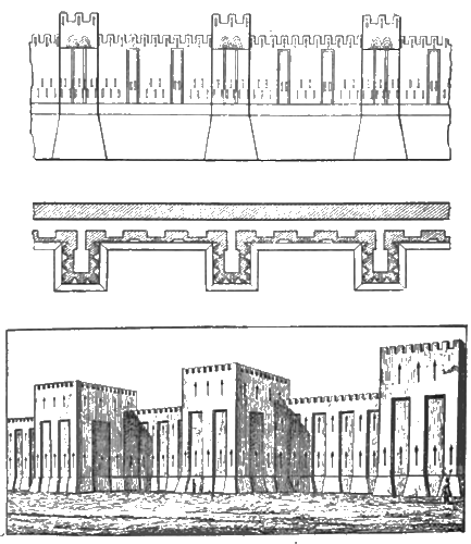 Третью линию образовывали стены собственно города, мощный квадрат которого возник еще в пору селевкидского владычества. Теперь городские стены укрепились благодаря нескольким последовательным пристройкам. Под их панцирем оказалась погребенной древняя селевкидская стена. Прямоугольные башни фланкировали крепостной обвод Гяур-калы.