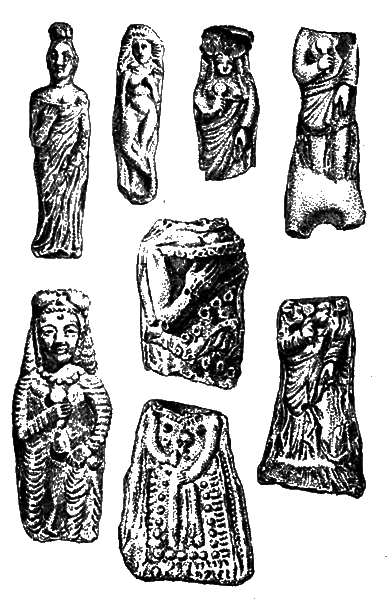 Бедность и богатство, просвещенная грамотность и темное суеверие сосуществовали в этом огромном городе. Но и надменный богач, и жалкий бедняк неизменно обращались с молитвами к богам, испрашивая у них помощи в торговых делах или ища утешения. Археологами во множестве найдены в Маргиане. терракотовые статуэтки. Как и в Бактрии и Согде, они изображали всесильных божественных покровителей. Возможно, эти образки ставились у стен в домашних часовнях. Во всяком случае тыльная сторона у них, как правило, обработана грубо и начерно. Так же как и в других среднеазиатских областях, предпочтение отдавалось женскому божеству, вероятно более отзывчивому. В ранний период был распространен образ нагой богини, но к началу нашей эры наиболее популярными становятся стройные фигурки женщин, облаченных в одежды античного типа и держащих зеркало судеб в правой руке. Позднее терракотовые статуэтки становятся грубее и приземистее. Тяжелые одежды, за которыми уже совсем не чувствуется форм тела, обильно украшены нашивными бляшками. Видимо, эта мода широко распространилась в Мерве в позднепарфянский период на радость мастерам, изготовлявшим женские побрякушки.