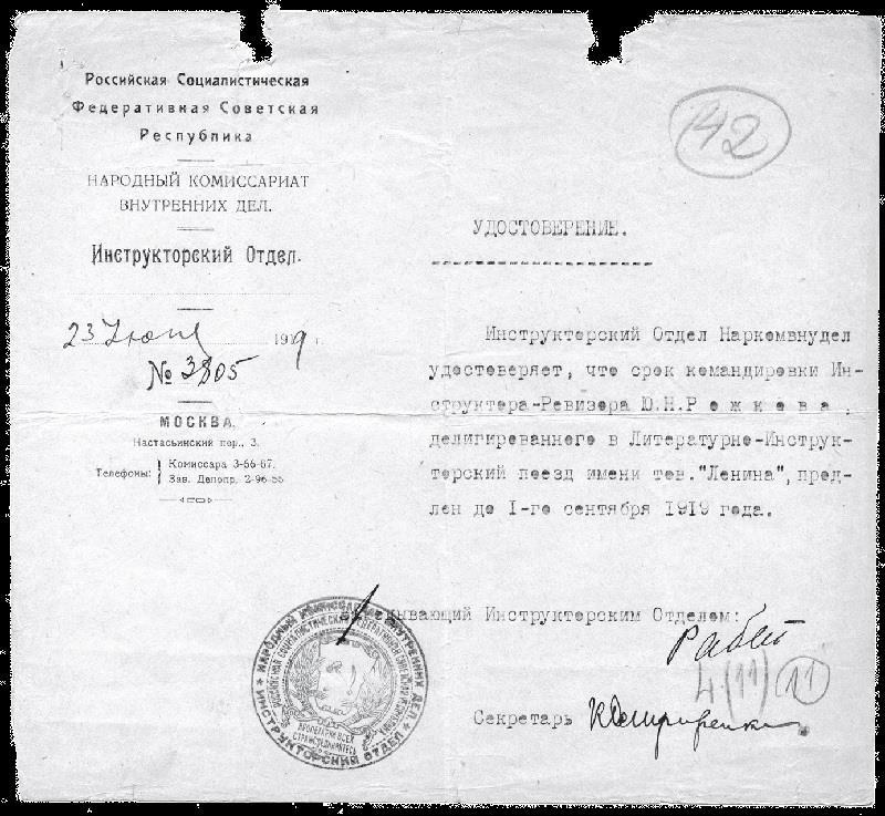 «Литературно-инструкторский поезд им. В.И. Ленина» был первым из агитпоездов, созданным в августе 1918 года. Он тут же отправился в Казань, только что отбитую у белочехов. Поезд был оборудован радиостанцией, типографией, библиотекой, киосками и магазинами, реализующими прессу, один из вагонов превращен в кинозал, другой – в редакцию газеты. Несколько вагонов, разумеется, занимал так называемый «политотдел», который составляли штатные агитаторы ЦК РКП(б), одним из которых и стал бывший гимназист и бывший красноармеец Юрий Рожков.