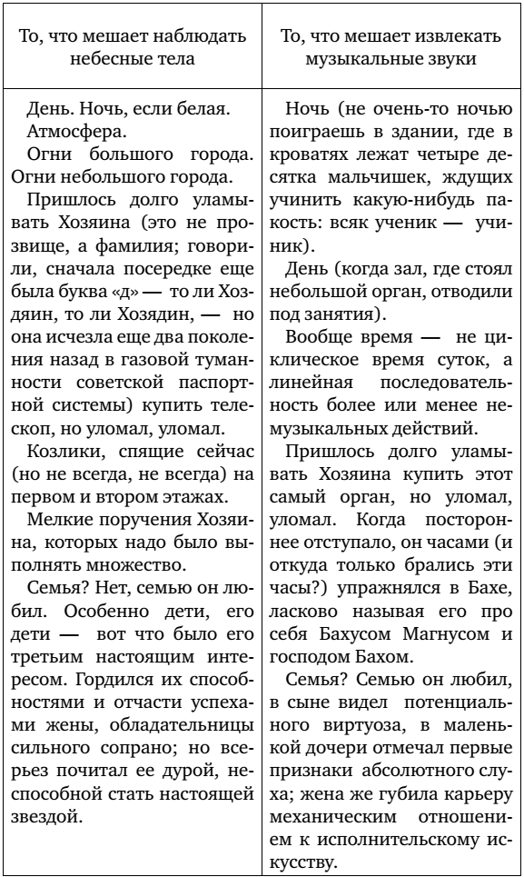 Жил Звездочет исключительно духовной жизнью: часто и помногу ел и от этого изрядно расползся, но по-настоящему занимали его только небо и музыка. Именно поэтому его раздражало почти все, что не было музыкой и небом. Все эти отвлекающие штуки, в сущности, пни и корни на тропе духа, торчали параллельно, образуя самостоятельную аллею либо таблицу.