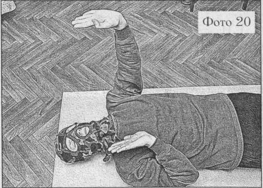 1. Из исходного положения согните в локте правую руку и расположите ее так, чтобы ладонь находилась над правым плечом, а локоть был направлен вправо. Ладонь должна быть направлена вверх, а пальцы указывают влево (фото 21).