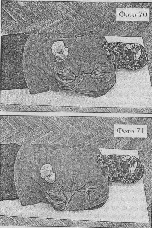 7. Сделайте левой рукой широкий полукруг в горизонтальной плоскости перед собой, влево – вниз, оставляя ладонь в процессе этого движения направленной вверх (фото 69). В нижней точке полукруга в тот момент, когда ладонь находится сбоку над областью левого подреберья, захватите энергию в кулак (фото 70) и резко дерните локоть вниз, как бы вырывая что–то из области, расположенной над селезенкой и поджелудочной железой.