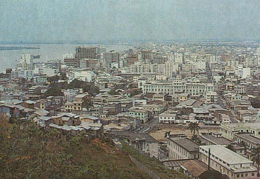 От жителей Гуаякиля можно услышать такое выражение: "Один из великих путешественников прошлого назвал Гуаякиль "тихоокеанской жемчужиной"". Не Эсмеральдас, не Манта и не Мачала, стоящие на океанском берегу, а именно речной Гуаякиль считается колыбелью эквадорских мореходов. Если верить местным источникам, то именно здесь был построен первый во всей (!) Латинской Америке пароход. Нельзя ни согласиться с мнением "одного из великих путешественников прошлого", ни поставить его под сомнение: тот приближался к Гуаякилю на корабле, со стороны моря, а теперь к нему подлетают на самолете и первое знакомство с ним – с воздуха. С высоты же птичьего полета самый большой город Эквадора предстает не "голубой жемчужиной", а огромным серым пятном, рассеченным вдоль и поперек четкими пунктирами улиц и едва ли не со всех сторон окруженным водой: река Гуаяс и ее бесчисленные рукава и заводи накрыли город такой густой сетью, что вырваться из нее он не в состоянии.