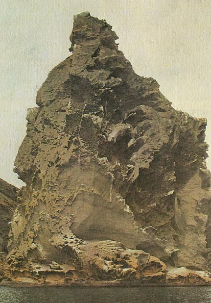 Остров Бартоломе открывается взору невысокими горами с округлыми вершинами и соседним островком Сантьяго, который рыбаки именуют Башней. По мере приближения все отчетливее вырисовываются и красно-коричневые горы, и берег, изрезанный небольшими заливами. Их, словно бессменные часовые, сторожат выступающие из воды скалы причудливых очертаний.