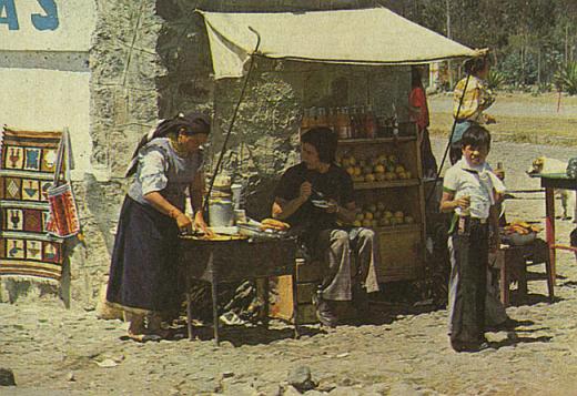 Вместе с тем многое здесь сохранилось и от вчерашнего дня: лавочки кустарей, в которых продают всевозможные сувениры – от серебряных поделок до деревянных масок каких-то вовсе и не эквадорских богов и чудовищ, тележки с жаровнями, источающими неотразимый аромат жареных шашлычков – "антикучо", и конечно же "коммерсанты", торгующие вразнос яркими пончо, шерстяными поясами, накидками, шапочками.