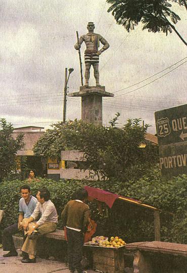 Санто-Доминго-де-лос-Колорадос встретил нас беспорядочным движением машин, пешеходов, строительными лесами на каждом шагу, разрытыми улицами, на которых прокладывались новые коммуникации, а главное – одной из самых колоритных городских достопримечательностей – скульптурой индейца Колорадо. Она стоит в окружении густозеленых кустов и цветущих олеандров в скверике, в центре треугольной площади, которую впору назвать пустырем.