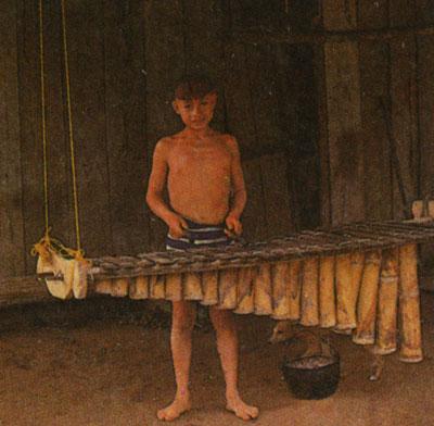 Вплотную к дому примыкает обширный навес. Сооружение это имеет чисто хозяйственное назначение. Здесь ткут, толкут зерно, готовят пищу, здесь хранят овощи в плетеных корзинах и воду в больших глиняных горшках, здесь же, судя по "креслам", сделанным из толстых палок, и веревочным гамакам, висящим между опорными столбами, семья отдыхает. Под этим навесом принимают туристов. Именно принимают, иначе трудно объяснить, зачем тут небрежно, вроде бы ненароком, были разбросаны длинные и тонкие, с заостренными концами прутья (турист должен сам догадаться, что это копья для охоты на крупную рыбу), зачем возле стены стоял наготове ткацкий станок с натянутой основой, зачем к стропилам у самого края навеса (лучшее место для фотографирования!) был подвешен... ксилофон. Инструмент поражал своей примитивностью, точнее, той "экзотической первобытностью", на какую падки иностранные туристы: к толстым деревянным планкам-клавишам снизу были прикреплены бамбуковые трубки разной величины, выполнявшие функцию резонатора. Вот старший сын, не дожидаясь просьбы, подошел к ксилофону, взял в руки палочки-молоточки и, приняв отработанную позу, с бесстрастной улыбкой на лице стал терпеливо смотреть в объектив... Что ж, он честно заработал свой доллар!
