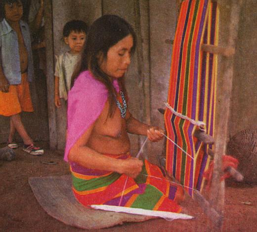 А вот к одежде Колорадо вполне применимо слово "цветная". Когда к нам вышла жена Хосе Амадора, я поразился яркости ее наряда: на плечах – розовая накидка, на бедрах – красно-желто-зеленая полосатая ткань. Совсем иначе были одеты дети. На малышах – обычные рубашонки и штанишки, причем в их одежде, как и в одежде взрослых, преобладал красный цвет. На четырехлетней девчушке были красные брючки и ботиночки, а ее братишка и вовсе выглядел "горожанином": рубашка в красных цветочках, джинсы, резиновые сапожки. Тот, что постарше и уже ходит в школу, как и его родители, "одет для туристов": на нем только набедренная повязка из полосатой сине-белой ткани.