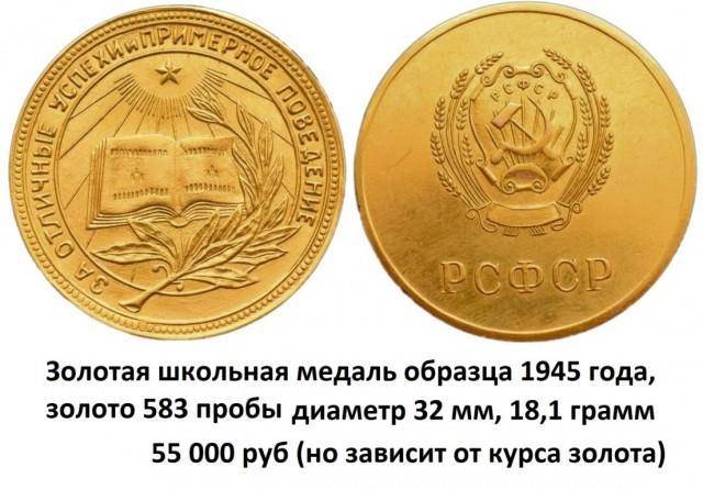 К аттестату прилагалась золотая медаль из золота 583 пробы и имела диаметр 32 мм, вес – 18,1 грамм.