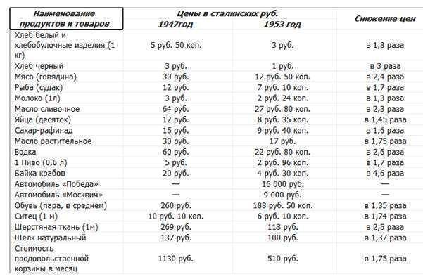 После 1945 года масштабы удешевления товаров еще больше увеличились. Первое послевоенное снижение цен состоялось уже в декабре 1947 года. Коммерческие и пайковые цены были отменены и преобразованы в единые. На 10–12 процентов подешевели хлеб, мука и крупы. В 1948 году стали доступнее на 10 процентов автомобили «Москвич». Мотоциклы и велосипеды подешевели на 20 процентов. Самое грандиозное снижение цен произошло 1 марта 1950 года, когда буханка хлеба в один момент подешевела на 26–30 процентов. Цены на говядину и свинину снизились сразу на 24 процента. Сливочное масло подешевело на 30 процентов. При Сталине в начале пятидесятых годов регулярно дешевел бензин. Например, только в 1951 году в Советском Социалистическом Союзе цена за литр снизилась на 20 процентов.