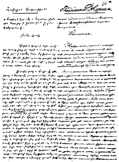 Чтобы ознакомить Гайканский народ с его историей, литературой, чтобы поставить его в духовное сношение с образованною Европою, признаем в высшей степени важным основание журнала на Гайканском языке, который, по нашему мнению, должен поставить себе задачею, как уже выше изложено, в легких, общепонятных формах сообщать Армянам: