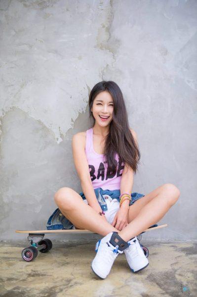 Мы гуляем уже с полчаса. Видим, как у одной из стен дома примостилась на роликовой доске молодая кореянка, по-моему, школьница – так по крайней мере она выглядит.