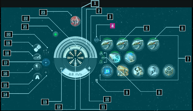 «Начальный этап обучения: Знакомство курсанта с панелью управления. На ней расположены следующие ручки и копки органов управления кораблём: