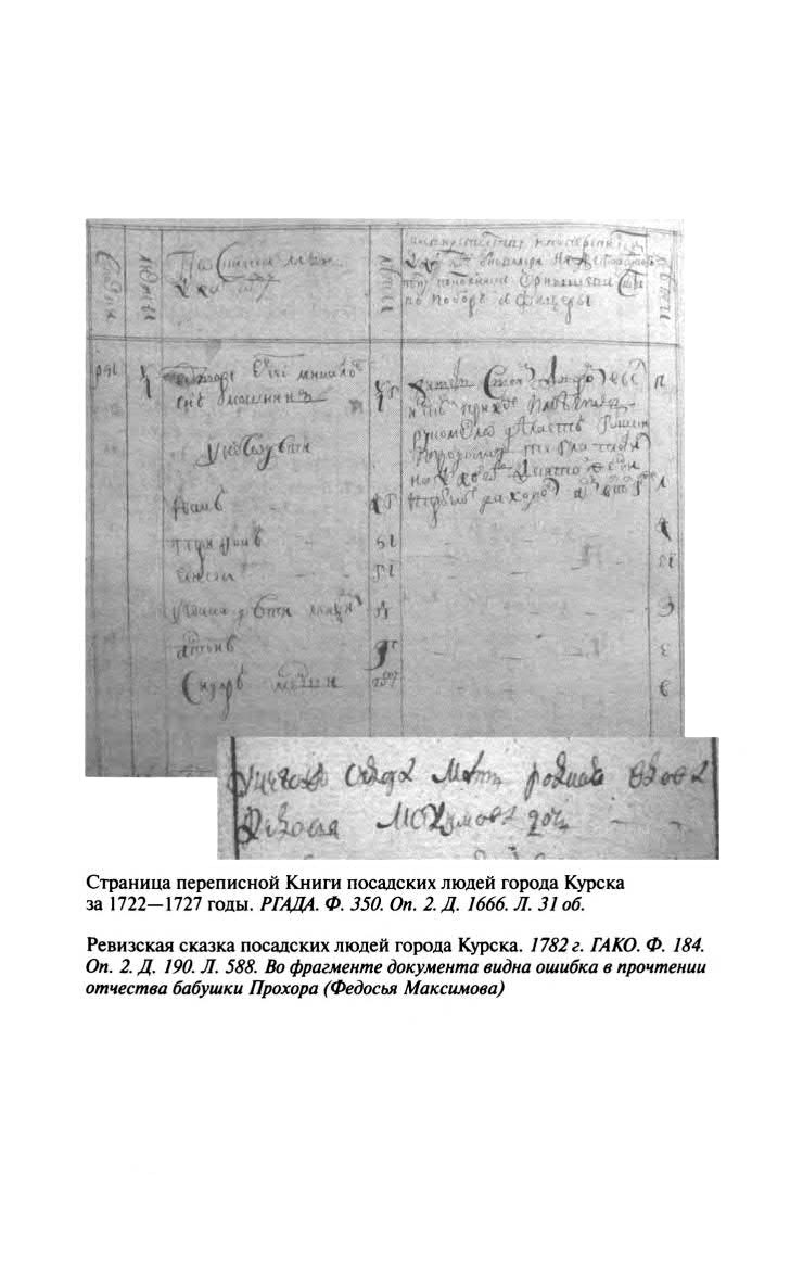 1764 год памятен семье Мошниных двумя событиями. Во-первых, смертью бабушки Федосьи Максимовны162. Следует обратить внимание на отчество бабушки – до сих пор во многих «Помянниках сродников преподобного Серафима Саровского» и житийной литературе записано имя Наум как отец Федосьи. При тщательном изучении архивного дела «Ревизские сказки 4-й ревизии о купцах и мещанах города Курска», в котором записана и семья Агафьи Фотиевны Мошниной, обнаружена ошибка историков начала XX века, неверно расшифровавших запись писаря. Отчество родной матери Сидора Ивановича Мошнина (бабушки Прохора) не Наумовна, а Максимовна.