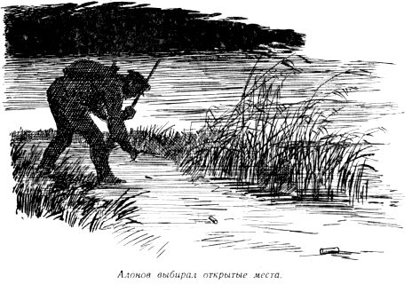 Алонов выбирал на берегу чистые, незаросшие места – лысины, которые всегда бывают там, где в почве много песка. Некоторые гильзы он слегка втыкал шляпками вверх. Другие просто клал на землю. Он старался мысленно найти путь, который, естественно, выберет человек, охотник, который будет обходить озеро. Сам он, конечно, заметил бы гильзы, разложи их другой так, как сделал он.