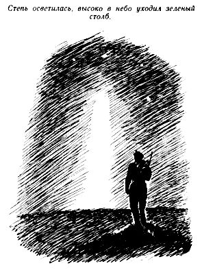 Вскоре – Алонов еще не задремал – ощущение света, проникшего сквозь опущенные веки, заставило его открыть глаза. Степь осветилась. Очень высоко в небе, гася звезды, зажглась зеленая полоса. На землю падало сияние, слабое, но достаточное, чтобы Алонов мог увидеть свои руки, ставшие тоже зелеными, как вялая трава. А знакомая высотка оказалась совсем недалеко. Алонов взбежал на ее гребень.