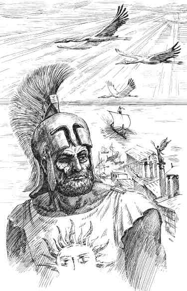Лише білий пишний султан на шоломі вказував, що Керікл не просто воїн, а міський начальник. Про це говорив і знак сонця у нього на грудях, на шкіряній нашивці безрукавки. Голі руки і ноги Керікла були засмаглі до чорноти.