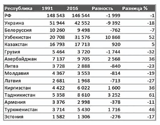 Вторая таблица позволяет сравнить численность населения в бывших республиках СССР до его распада с настоящим временем. Видно, что прирост населения быстрыми темпами идёт в мусульманских странах. В тех странах, которые рвутся или уже дорвались в ЕС, наоборот, население сокращается быстрыми темпами. Это идёт за счёт отъезда населения из этих стран.