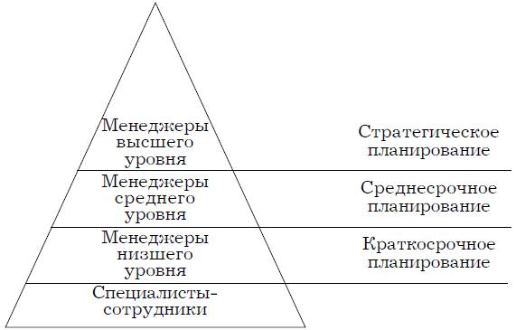 Пирамида управления организацией имеет широкое основание – большое количество управляющих низшего звена, количество руководителей среднего звена – меньше, вершина пирамиды – руководители высшего звена