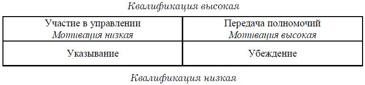 Как показывает практика, выбор того или иного варианта руководящего стиля дает свои результаты только при соответствующих условиях. Лидерский стиль зависит от ситуации и ни один из них не может являться оптимальным на все случаи жизни. Это положение привело к разработке в теории менеджмента ситуативных моделей лидерства. Одна из них – Поля Херси и Кеннета Блэншарда, в качестве двух основных переменных берет уровень квалификации подчиненных и их мотивацию, т. е. желание работать. На основе этих двух переменных возникает та или иная степень социальной зрелости подчиненных, с которой приходится считаться руководителю. В зависимости от этого он прибегает либо к стилю указывания, либо убеждения, либо привлекает работников к участию в управлении, либо делегирует им свои полномочия (рис. 4.2).