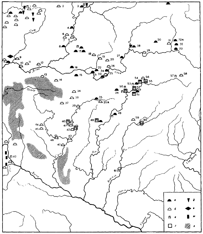 а – курганные могильники с трупосожжениями; б – курганные могильники исключительно с трупоположениями; в – находки спиральных височных колец; г – находки шейных гривн северян; д – находки радимичских височных колец; е – курганы с глиняными площадками под трупосожжениями; ж – памятники кочевников; з – солонцеватые почвы.
