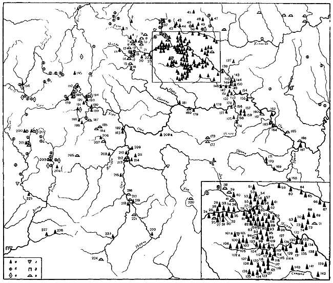 Вятичские курганы с трупосожжениями сконцентрированы в бассейне верхнего течения Оки (выше Калуги), и поселения VIII–X вв. известны только в той же юго-западной части вятичского ареала (карта 22). Нужно полагать что в последних веках I тысячелетия н. э. более северные и северо-восточные области Окского бассейна были не славянскими. Этот вывод согласуется с результатами новейших работ по изучению дьяковских поселений в бассейне Москвы-реки. Материалы Щербинского городища показывают, что это поселение было заселено вплоть до IX (может быть, X) столетия включительно (Розенфельдт И.Г., 1967, с. 90–98). Известны и другие поселения позднего этапа дьяковской культуры (Розенфельдт И.Г., 1974, с. 90–197). Дьяковские племена занимали весь бассейн Москвы-реки и прилегающую к нему часть поречья Оки. В то же время рязанское течение Оки принадлежало племенам, оставившим группу рязанско-окских могильников, наиболее поздние захоронения которых относятся к VIII-Х вв. (Монгайт А.Л., 1961, с. 76, 78; Седов В.В., 1966а, с. 86–104).