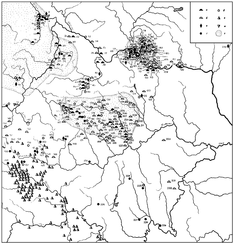 а – курганные могильники с захоронениями по обряду трупосожжения; б – курганные могильники, содержащие исключительно трупоположения; в – памятники с находками ромбощитковых височных колец; г – памятники с находками браслетообразных завязанных височных колец; д – памятники с находками браслетообразных височных колец с сомкнутыми концами; е – памятники с находками вятичских колец; ж – памятники с находками радимичских колец; з – области распространения курганов с каменной обкладкой в основании.